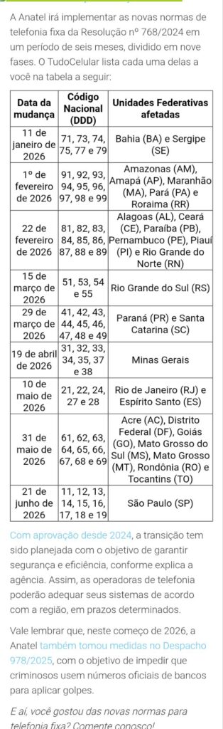 A Agência Nacional de Telecomunicações vai implementar novas regras para a telefonia fixa a partir de 11 de janeiro de 2026, com o objetivo de baratear as ligações em todo o país. As mudanças fazem parte da Resolução nº 768/2024 e a implantação será concluída até junho de 2026.