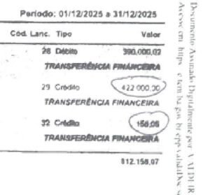 De acordo com o demonstrativo oficial referente ao período de 01 de dezembro a 31 de dezembro de 2025, consta o registro de 390.000,00 reais como transferência financeira. No mesmo documento aparecem dois lançamentos de devolução: 422.000,30 reais e 150,08 reais, totalizando 422.150,38 reais devolvidos ao Poder Executivo.