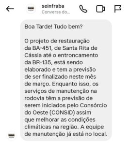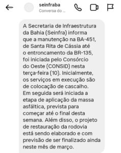 A informação foi divulgada em resposta a questionamentos feitos por moradores nas redes sociais sobre as condições da rodovia, que atualmente apresenta diversos buracos e trechos deteriorados. A BA-451 é uma importante ligação entre Santa Rita de Cássia e o distrito de Entroncamento, no município de Riachão das Neves.