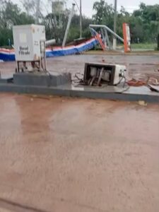 Um dos danos mais expressivos aconteceu em um posto de combustíveis localizado na entrada da cidade, onde a cobertura metálica foi despedaçada pelos ventos e arremessada, deixando a estrutura do estabelecimento seriamente comprometida.